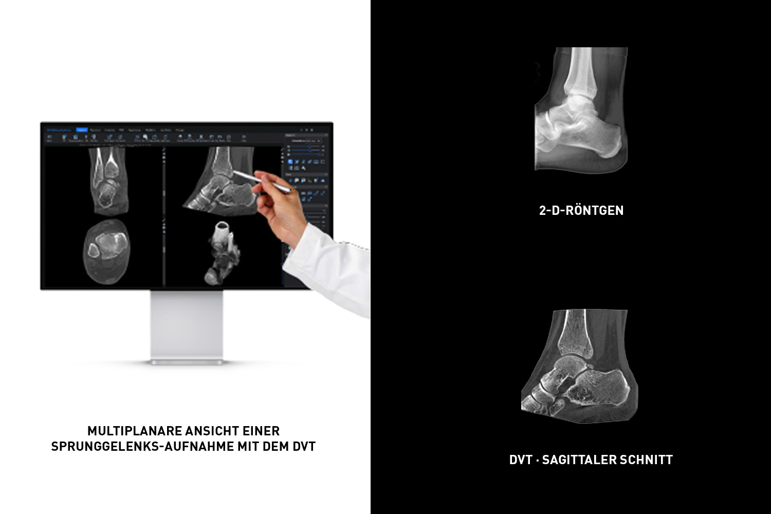 Der digitale Volumentomograph (DVT) fertigt dreidimen-sionale Röntgenaufnahmen für Kopf, Arme und Beine in-nerhalb von wenigen Sekunden an. Hierbei profitieren Patienten vor allem von der umittelbaren Verfügbarkeit in der Praxis und einer erheblich reduzierten Strahlen-belastung im Vergleich zu einem herkömmlichen CT.